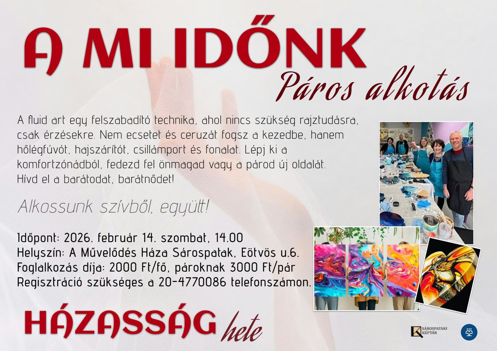 A rohanó hétköznapokban mindannyian vágyunk egy kis megállásra, feltöltődésre. Felnőtteknek szóló Énidőm műhelyfoglalkozásunkat ezúttal rendhagyó formában hirdetjük meg: baráti társaságoknak és pároknak, akik szeretnének közösen minőségi időt tölteni egymással. Hiszen néha nemcsak énidőre, hanem egy kis miidőre is szükség van. A fluid art technika nem igényel rajztudást vagy előképzettséget – sokkal inkább nyitottságot, kísérletező kedvet és elfogadást. A festékek áramlanak, találkoznak, keverednek, mi pedig megtanuljuk elengedni az irányítást, és hagyni, hogy a dolgok úgy alakuljanak, ahogyan szeretnének. Ez a műhely nem a tökéletességről szól, hanem az együtt megélt pillanatokról, a közös élményről és az alkotás öröméről.