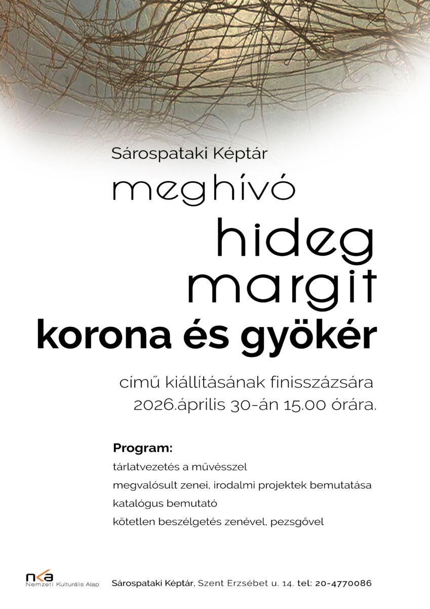 Április 30-ig látogatható Hideg Margit korona és gyökér című kiállítása, amely az elmúlt időszakban számos látogatót szólított meg, sokszor egészen váratlan módon. Volt, akit zenei gondolatokra ösztönzött, másokat irodalmi alkotásra indított, inspirált. Innen Erdélybe utazik tovább a kiállítási anyag. A következő helyszínen már egy retrospektív tárlat formájában találkozhat a közönség a művésszel és munkásságával, amely átfogóbb képet ad az alkotói pálya fontos állomásairól. Elkészült a kiállítás katalógusa is. A kiadvány nemcsak a műveket mutatja be, hanem segít mélyebben megérteni a mögöttük húzódó gondolatokat és alkotói folyamatokat Finta Éva és Feczkó Ágnes tolmácsolásában. A záróesemény alkalmával ezt a katalógust is bemutatjuk az érdeklődőknek. A finisszázs különlegessége, hogy Hideg Margit személyesen vezeti körbe a látogatókat a termeken. Saját gondolatain keresztül mutatja be a műveket, így a befogadás élménye személyesebbé, érthetőbbé válik.